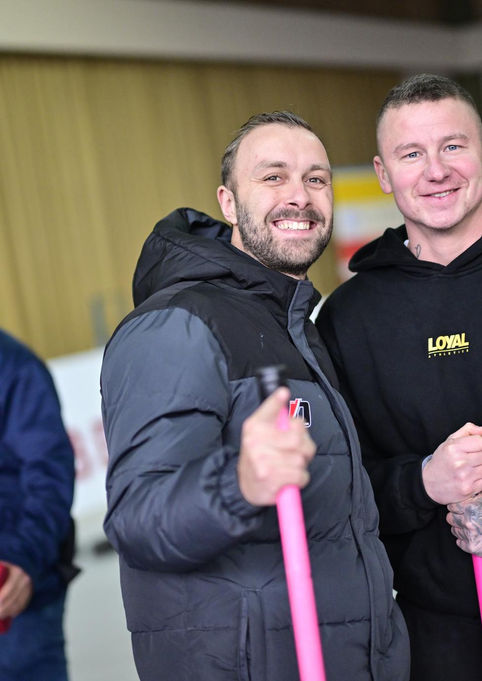 Noahkai Banks vom FC Augsburg nahm zum ersten Mal beim Charity Curling Event mit voller Freude teil (er startete im Team Herzen in Bewegung - Klinikum Augsburg)